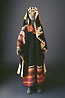Sulaym thobe showing the embroidery on the yoke, the shoulders and the appliqué on the hem. The rectangular black headdress is decorated with red fabric and nacre buttons arranged in geometric patterns. more