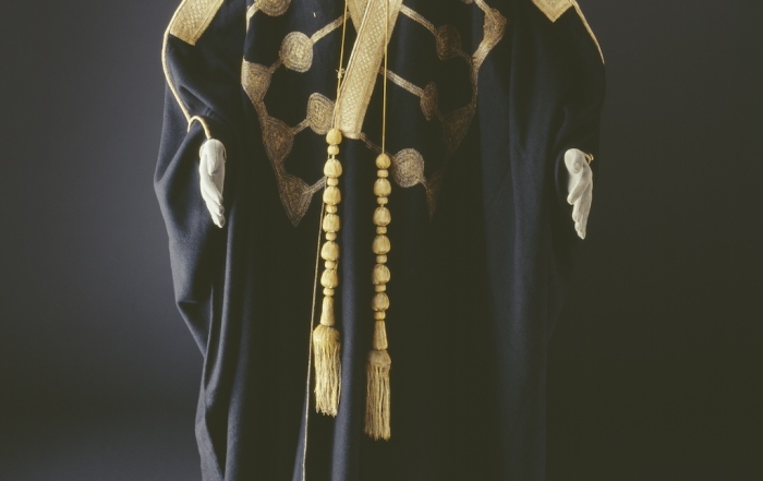 Qassim, Northern Region Qassim thick wool woman's aba (cloak) embroidered with gold thread and having elaborate gold thread tassels. This type of aba is for the bride to wear on her wedding night. The mountains[...]